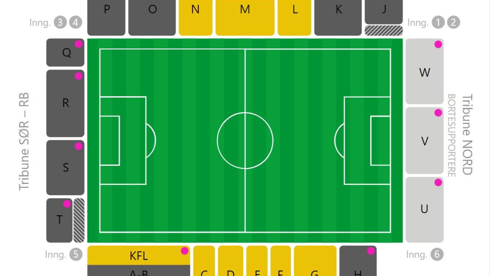 Fritt setevalg på felt H , O og på RB tribunen.