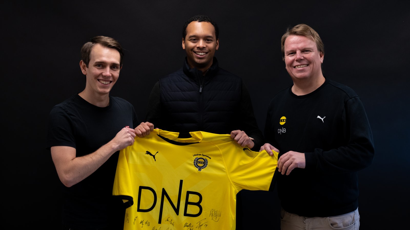 Gründer og daglig leder Kristoffer Lande (til venstre på bildet) og partneransvarlig David Salvail (i midten) er svært fornøyd med at selskapet i år er blitt sølvpartner i Lillestrøm Sportsklubb.