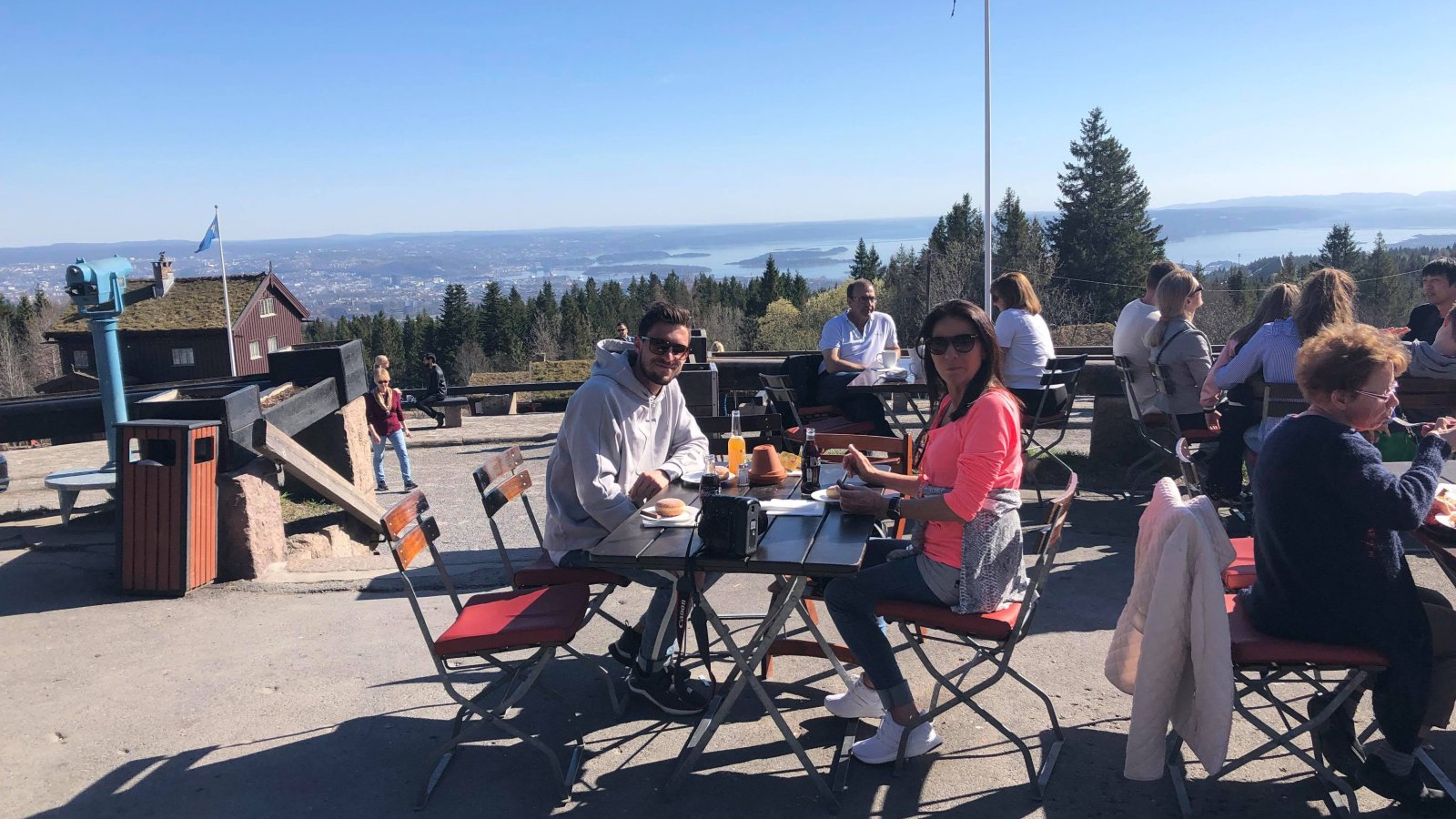 - Vi hadde fri på lørdag, så da passet det bra å ta med mine foreldre og min samboer på en liten utflukt - blant annet til Holmenkollen. Det ble en meget hyggelig opplevelse i et fantastisk vær. Vi dansker er jo ikke vant til så mye utsikt, sier Daniel og ler.
