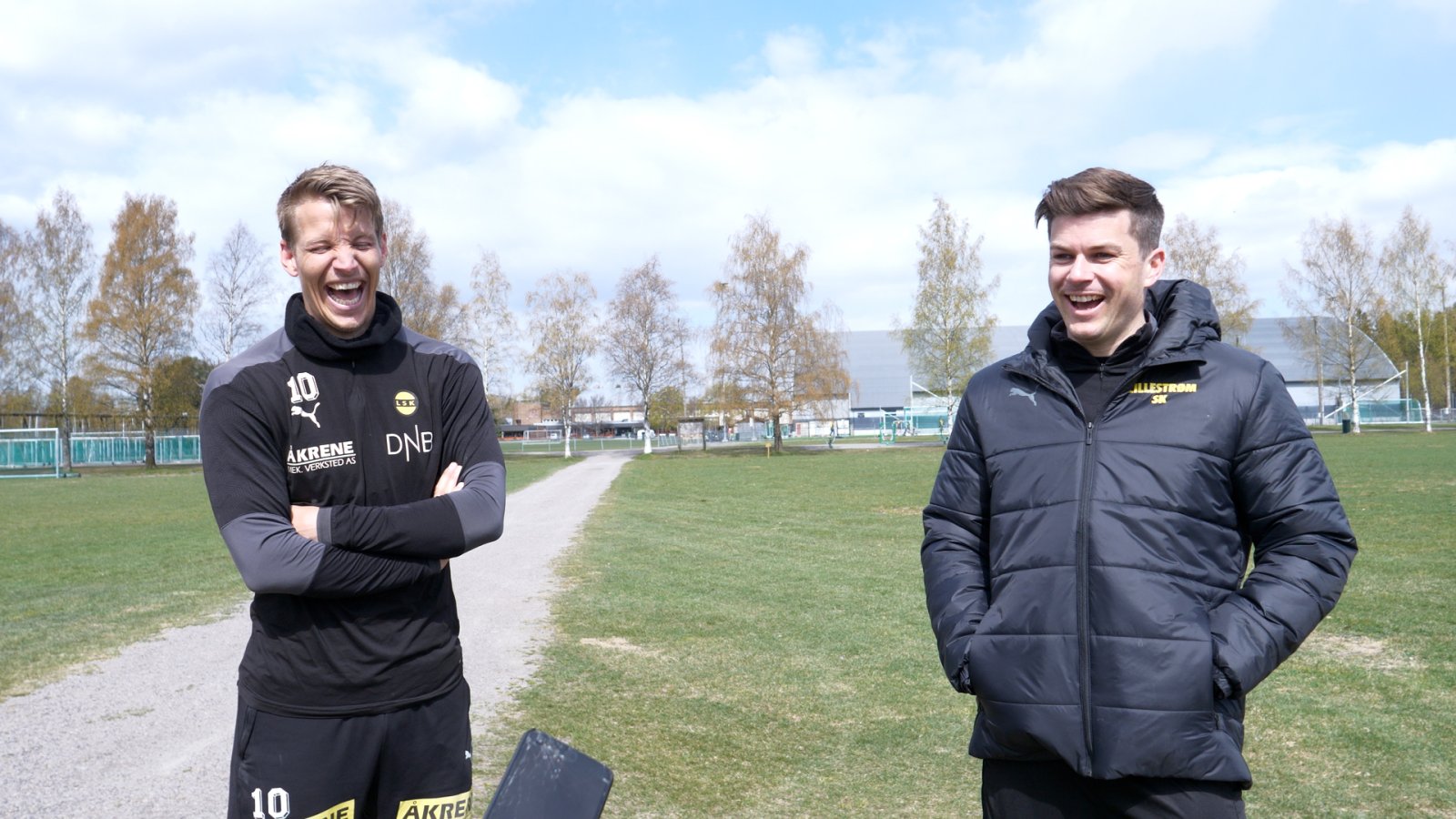 Thomas Lehne Olsen og Pål-André Helland fikk seg en god latter etter dagens trening da de fikk høre P4-spalten «Fem På» der det som skulle ha vært en LSK-supporter klikker i vinkel når han står i fare med å miste sesongkortet sitt. Video