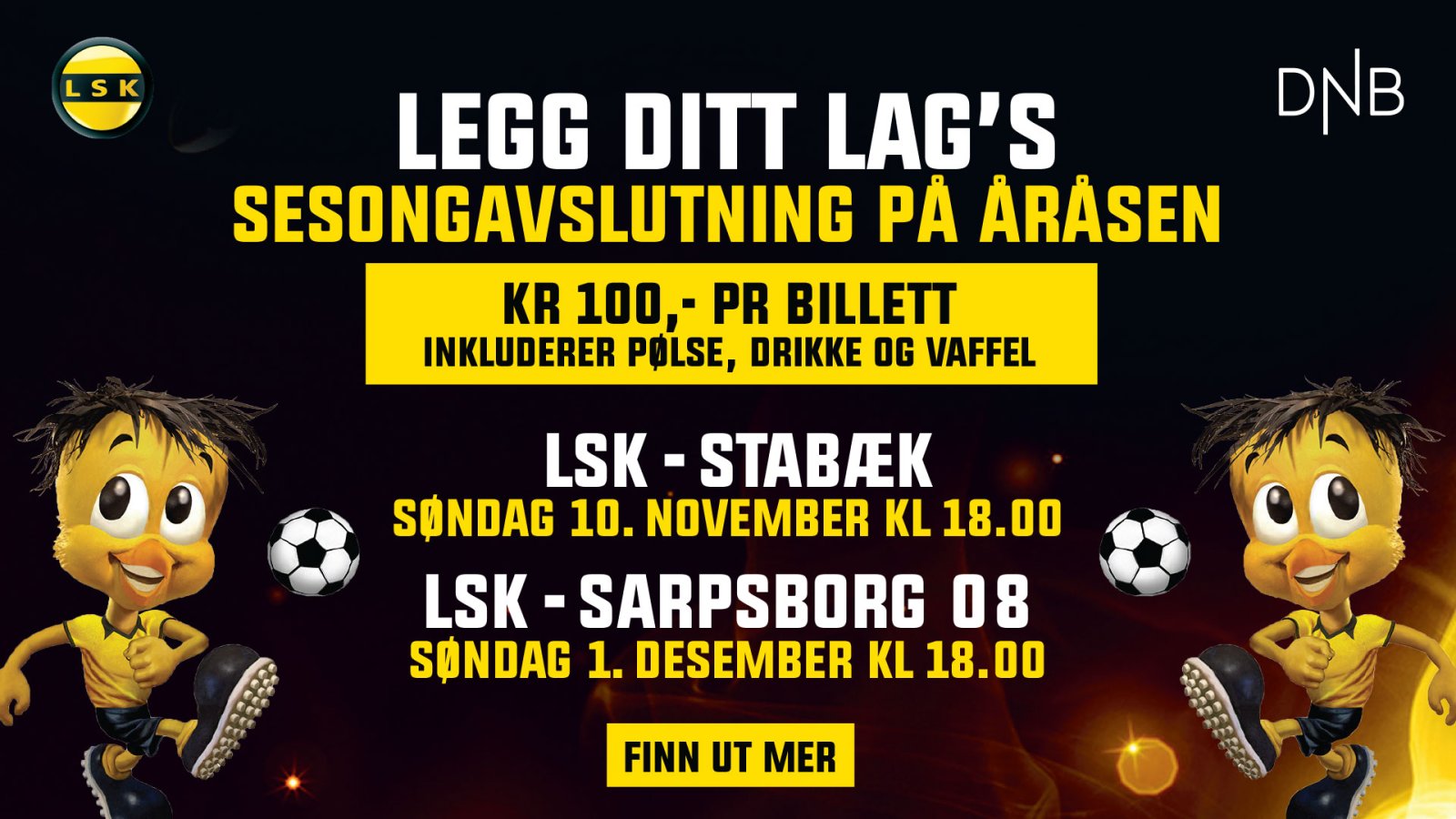 LSK og generalsponsor DNB har gleden av å invitere alle fotballag til å legge sesongavslutningen til Åråsen Stadion. Her får du et kjempetilbud på billetter, pølse, drikke og vaffel til spillere, trenere, lagledere og deres familier.