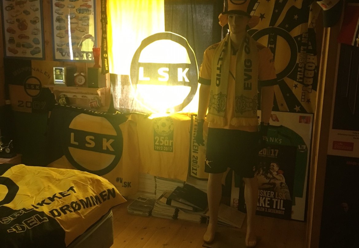 - Soverommet mitt er dekorert med gult og svart. Jeg har Lillestrøm-sengetøy, og moren min har sydd LSK-gardiner. Det er skjerf og plakater, og så har jeg en utstillingsdukke på 196 centimeter som jeg har kledd opp som Frode Kippe - med LSK-hatten som jeg har på meg på kampene. Dessuten har jeg masse avisutklipp om LSK på veggene. Jeg er jo litt gal. Før cupfinalen i 2017 måtte broren min ta toget til Lillestrøm for å sikre oss at vi fikk fire billetter til kampen på Ullevaal.