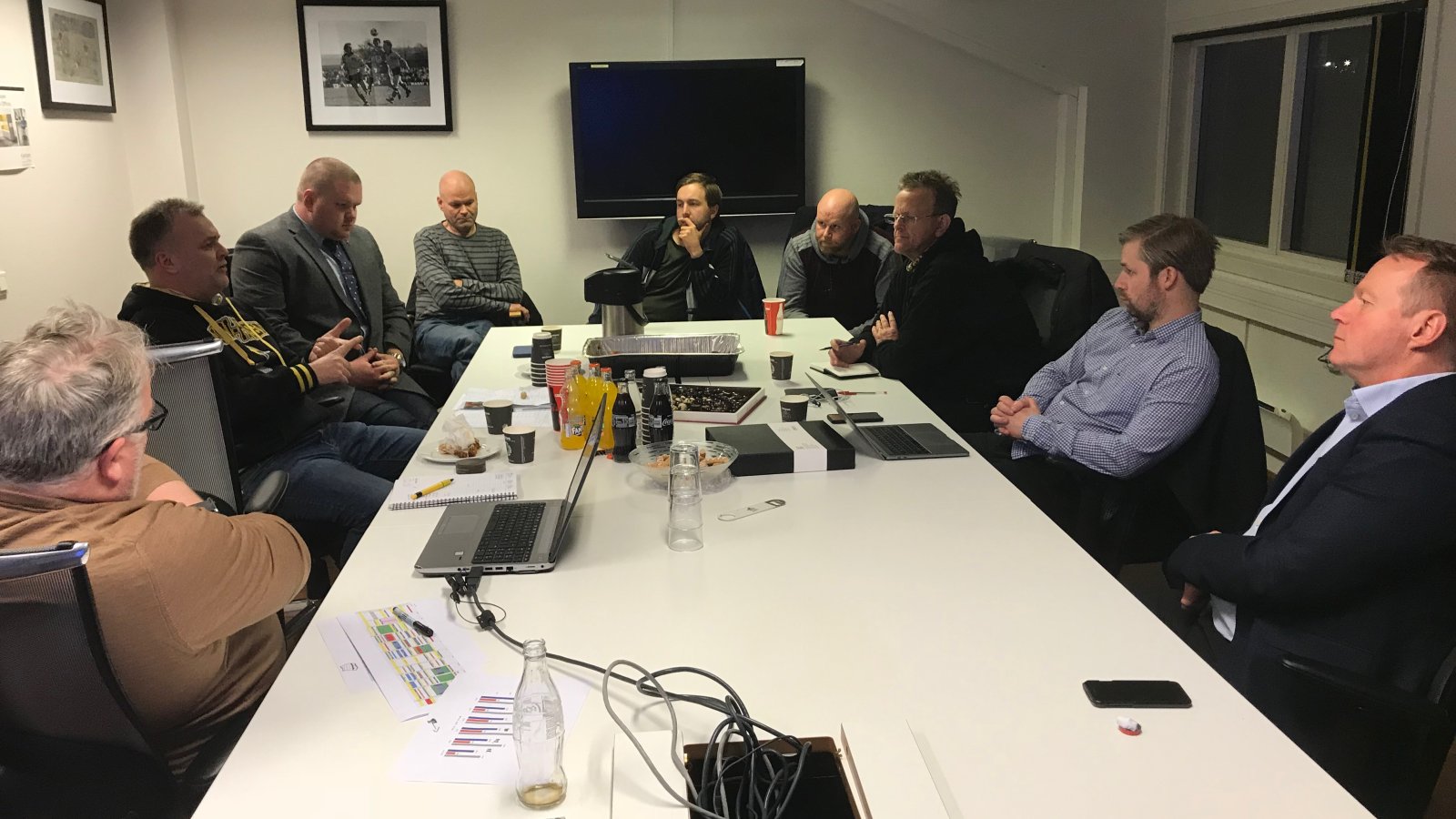 Arild Myklebust, Trym Hogner, Terje Holm, Lars Raastad, Patrick Ween, Egil Andresen og Tony Johansen deltok på møtet - sammen med styreleder Morten Kokkim, arrangementssjef Truls Lühr Olsen og kommunikasjonsansvarlig Morten Stokstad.