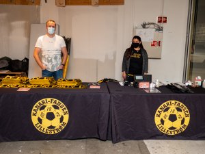 Håkon Henriksen og Christine Tovik i Kanari-Fansens styre er strålende fornøyd med åpningsdagene på LSK Shop Outlet på Lillestrøm Torv.