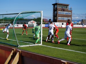 (Øygarden - Lillestrøm 0-0) Her bruker LSK-utlånte Charles Ezeh hånda på en knallhard corner fra Thomas Lehne Olsen - og redder på streken. LSK skapte klart mest i vest, men måtte ta til takke med ett poeng.