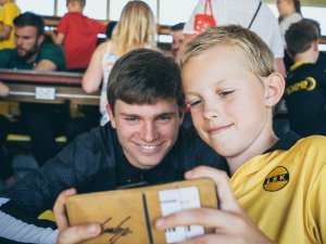 Bursdagsbarnet Magnus Knudsen (t.v) og resten av Lillestrøm-laget tok mange selfier og skrev enda flere autografer på lørdagens Åpen dag-arrangement.