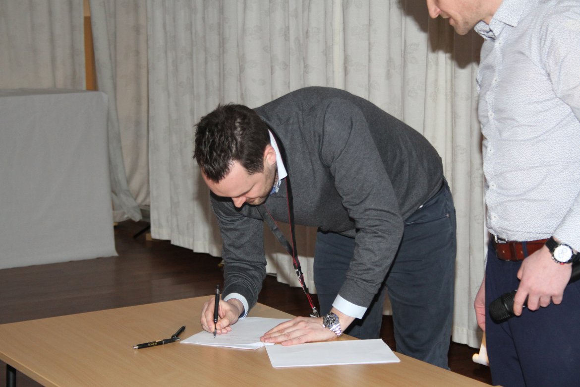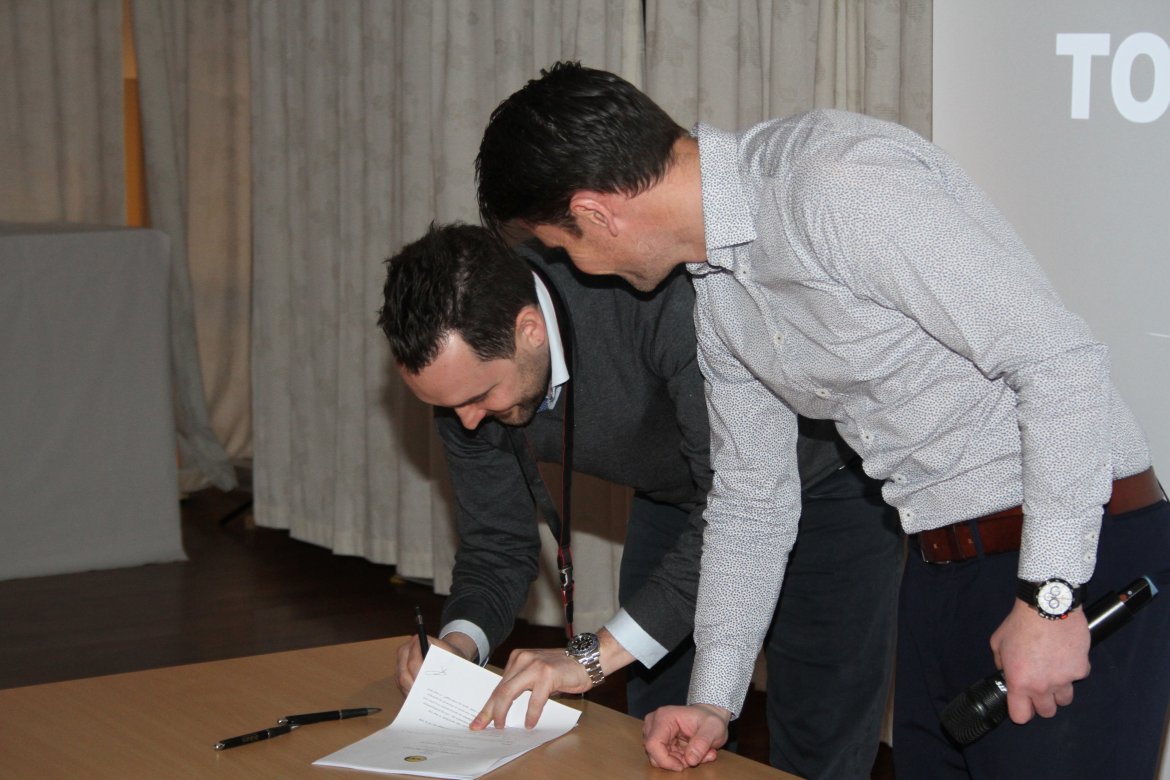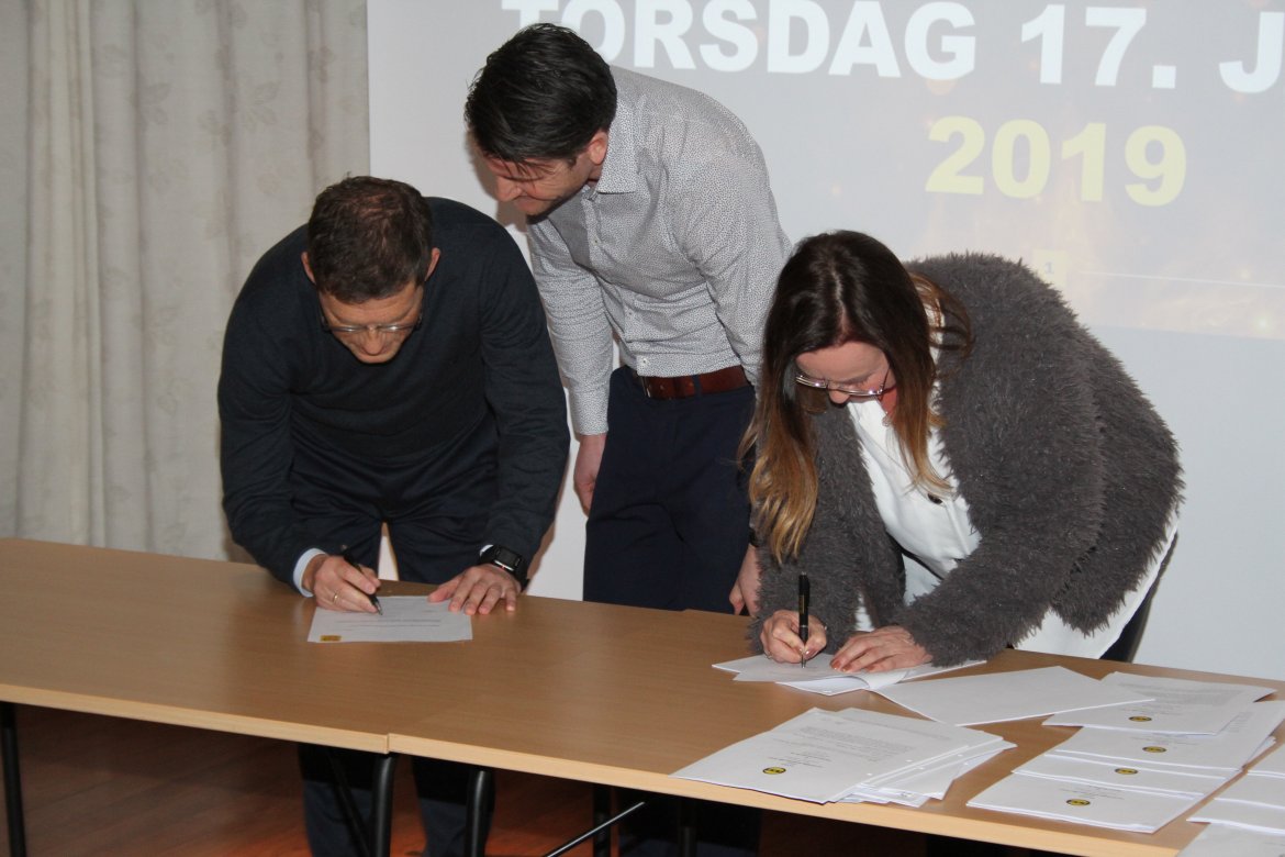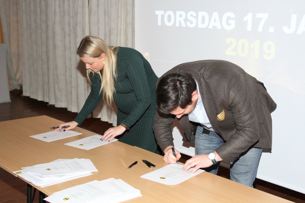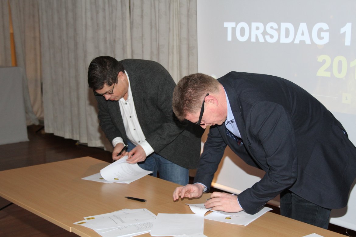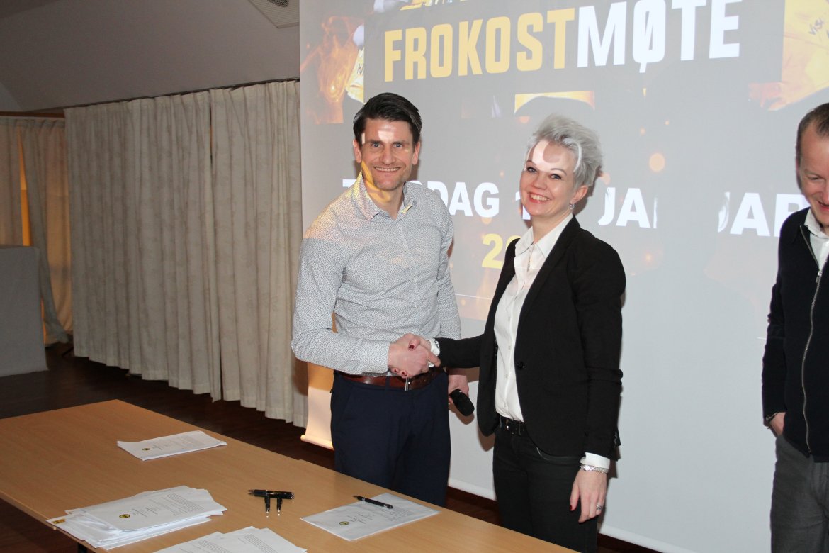 Signering av avtaler er en tradisjon på årets første frokostmøte. Også i år hadde markedsavdelingen jobbet på spreng for å få inn flest mulig avtaler før møtet. Den siste avtalen kom ut av skriveren etter at signeringen hadde startet, men rakk å bli signert før seansen bla avsluttet.